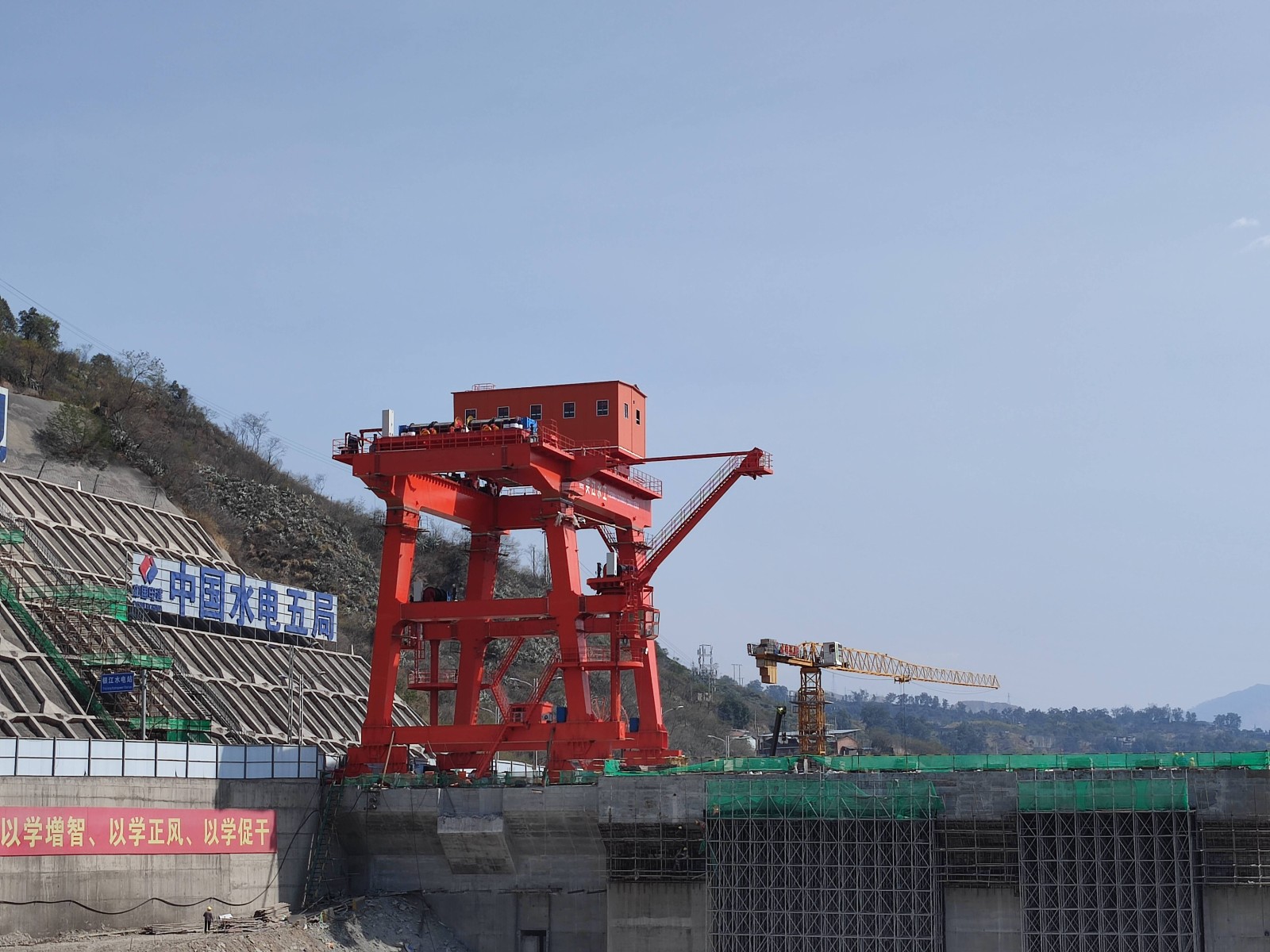 紅色門機迎江矗立。“大吊車真厲害,百噸設備輕而易舉提抓起來!”今年以來,攀枝花廣大市民陡然發現銀江水電站大壩上架起了一個紅色的大型設備,從幾公里外的市區一眼望去就能映入眼簾,成為銀江水電站的新標志。這個紅色巨物就是壩頂門機,高25米,寬16米,最大起吊能力達到500噸,起升高度達75米。是水電站建設期金屬結構安裝及后期電站運行最重要的設備之一,2024年將肩負起包括36扇閘門在內共計超萬噸的設備起吊任務。為順利推進施工,開年以來,川投能源攀水電公司通過增加臨時軌道提前籌備、堅持春節不停工等措施,加快實施壩頂門機供貨安裝,計劃4月中旬投入使用。