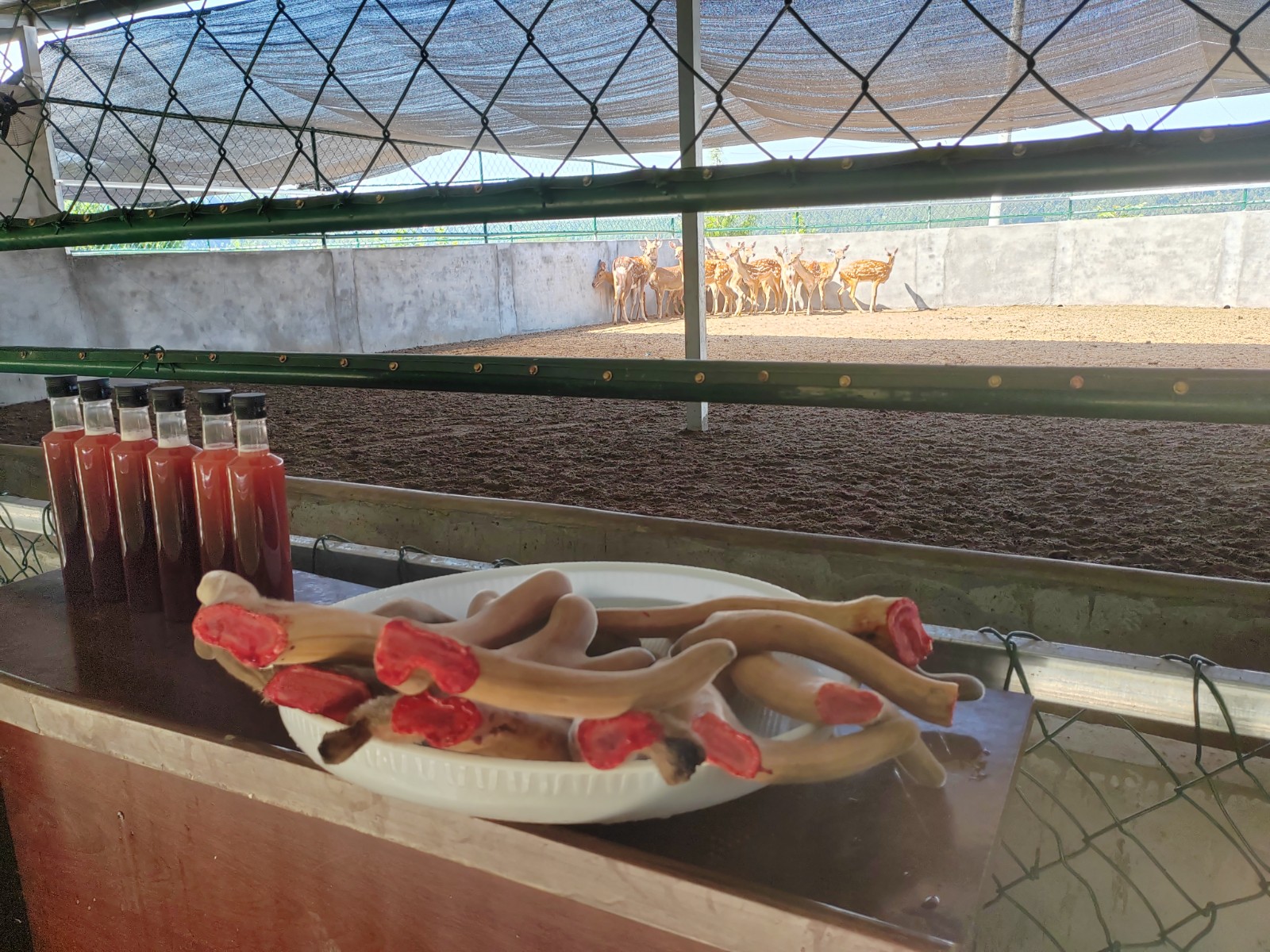 當天上午,插旗山村梅花鹿養殖基地圍滿了前來的村民,在技術人員的專業指導下,飼養員們規范操作,伴隨著鹿茸鋸清脆的“咔嚓”聲,一對對形如珊瑚、色澤鮮亮的鹿茸應聲而落,順利完成了首批6只梅花鹿的鹿茸收割。