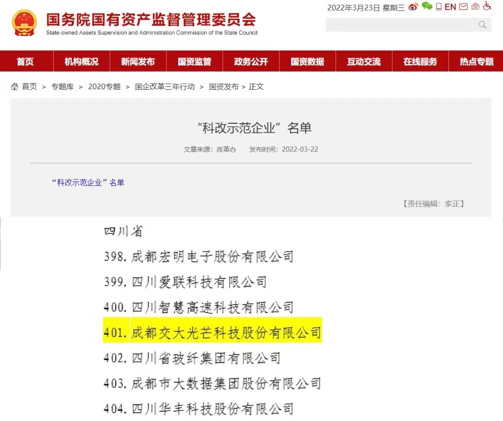 3月22日,國務院國資委網站公布《“科改示范企業”名單》,共440家企業納入“科改示范行動”,交大光芒為四川省七家入選“科改示范企業”之一。