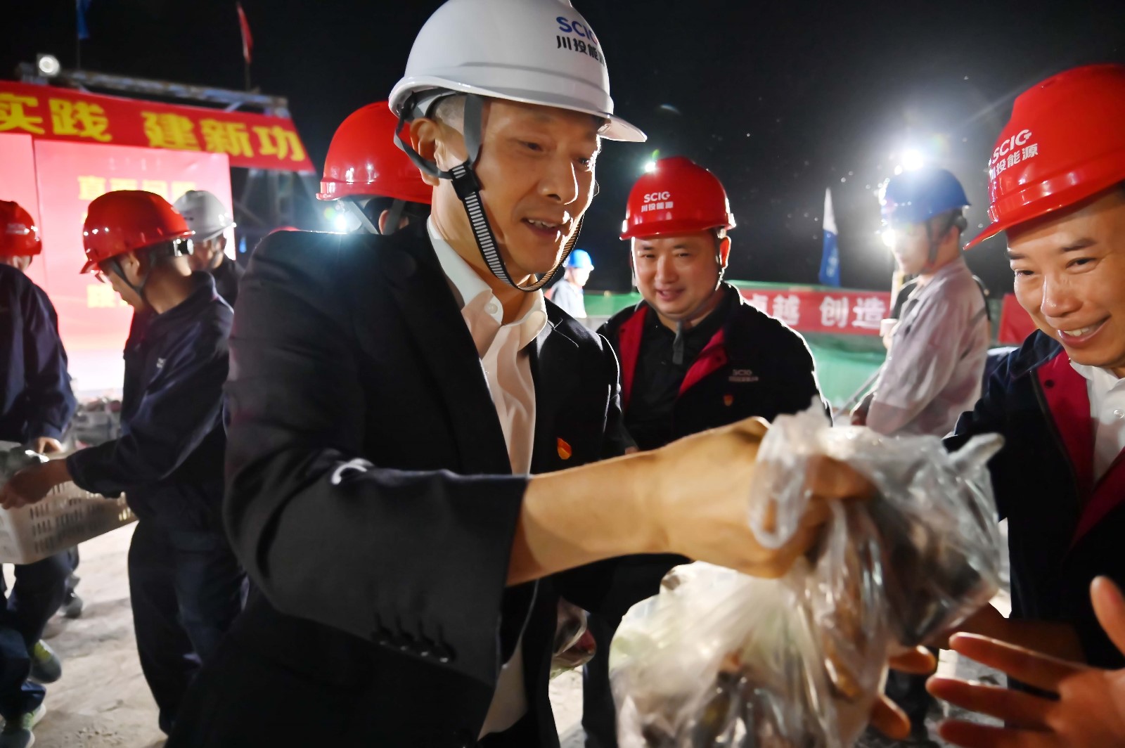 儀式開始前,受川投能源黨委書記、副董事長、總經理楊洪委托,冉蘭平一行慰問了挑燈夜戰在銀江大橋的一線工友們,把熱乎乎的雞腿、粽子、咸鴨蛋、牛奶等送到一線人員的手中。