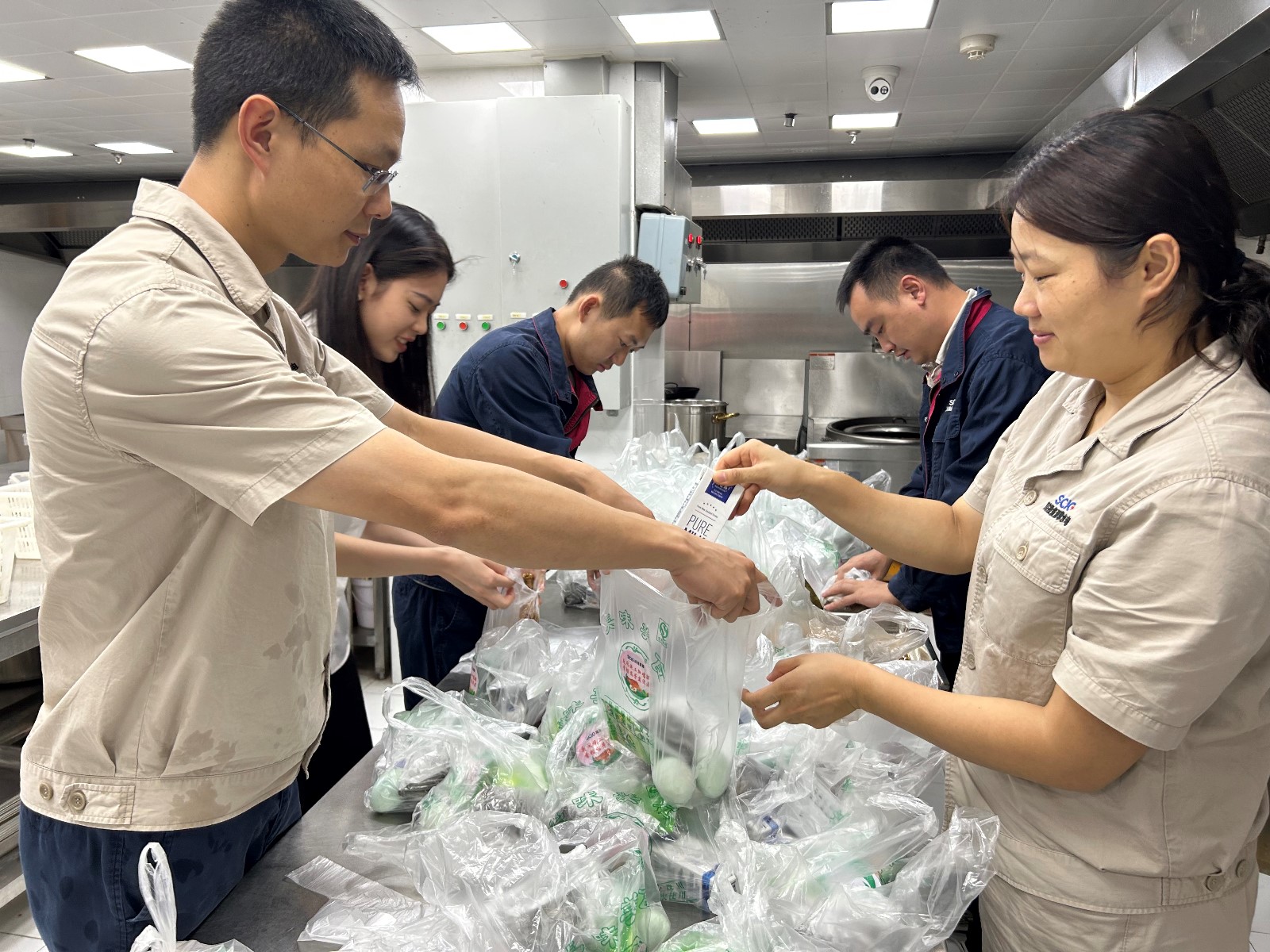 支部黨員、志愿者們放棄了難得的節日假期,下午就在職工食堂忙碌了起來,鹵雞腿,蒸粽子,煮鹽蛋,采用流水線工作方式,把熱乎乎的雞腿、粽子、鹽蛋、牛奶等提前進行分裝,方便工友們在工地食用。