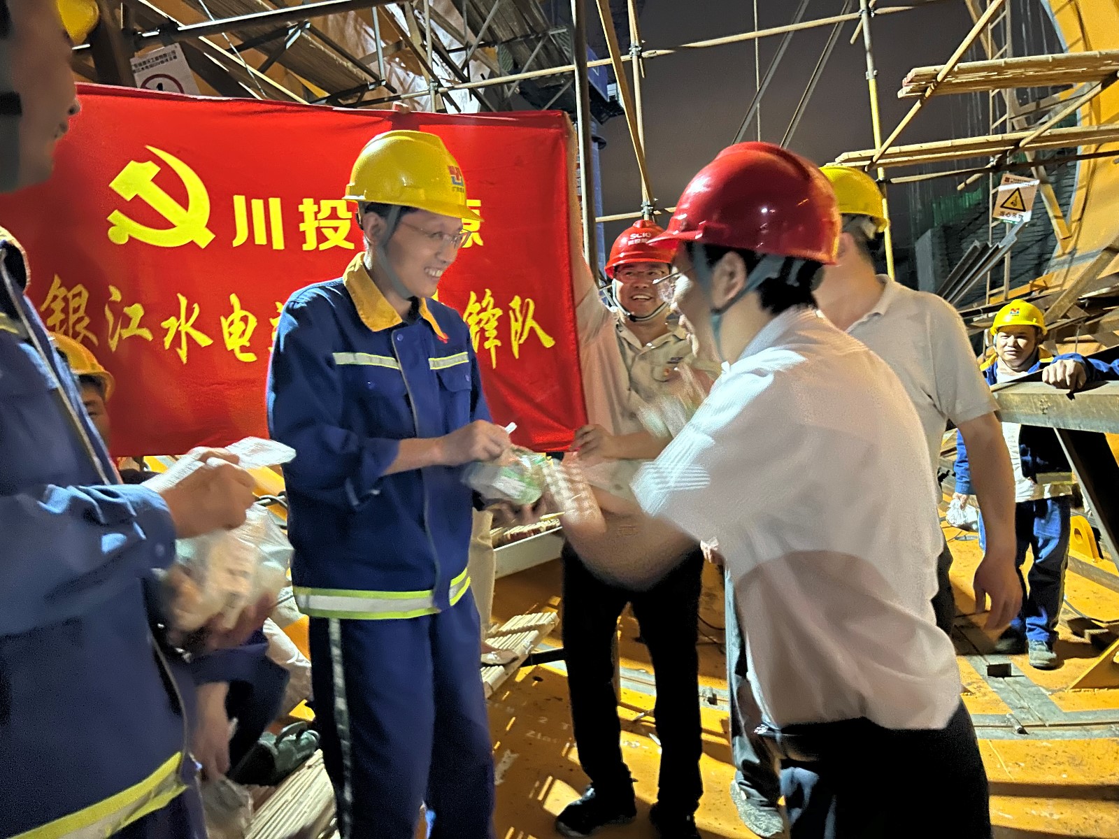 節日的銀江水電站施工現場,大壩混凝土澆筑、廠房尾水管機電安裝、混凝土拌和系統等各部位一片忙碌,為按期實現各項節點目標,800余名建設者依然奮戰在銀江水電站施工現場。夜晚的工地更是燈火通明,晚上九點,川投能源副總經理,公司黨總支書記、董事長徐孝剛帶領公司黨員先鋒隊、志愿者服務隊,深入混凝土澆筑倉面、尾水管、拌合樓調度室、防汛值班室、變電站、保安亭等部位,將熱乎乎的雞腿、香噴噴的粽子等慰問品送到正在施工的每位工友手上。徐孝剛講到:“端午節是中華民族重要的傳統節日,對大家堅持奮戰在銀江水電站施工現場斗酷暑、戰高溫、挑燈夜戰表示感謝,祝福大家端午安康!”活動中,徐孝剛還開展了夜間安全檢查,叮囑大家做好防護、確保施工安全。