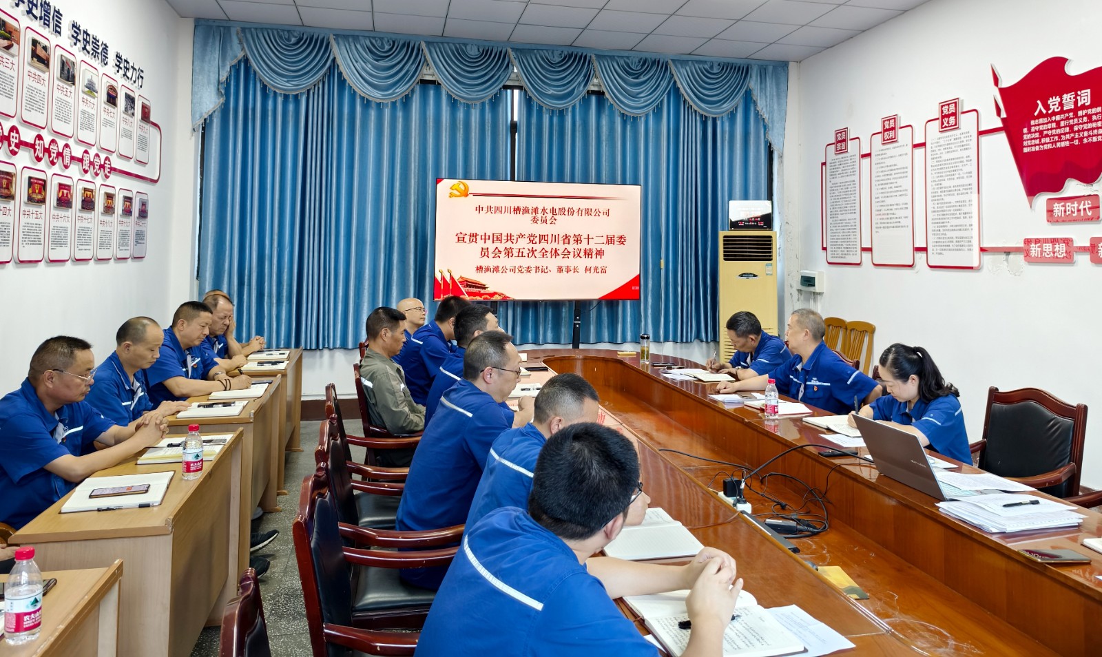 7月17日下午,槽漁灘電廠黨支部召開7月黨員大會暨主題黨日活動,槽漁灘公司黨委書記、董事長何光富出席會議并宣講省委十二屆五次全會精神,支部書記、廠長王力生主持。
