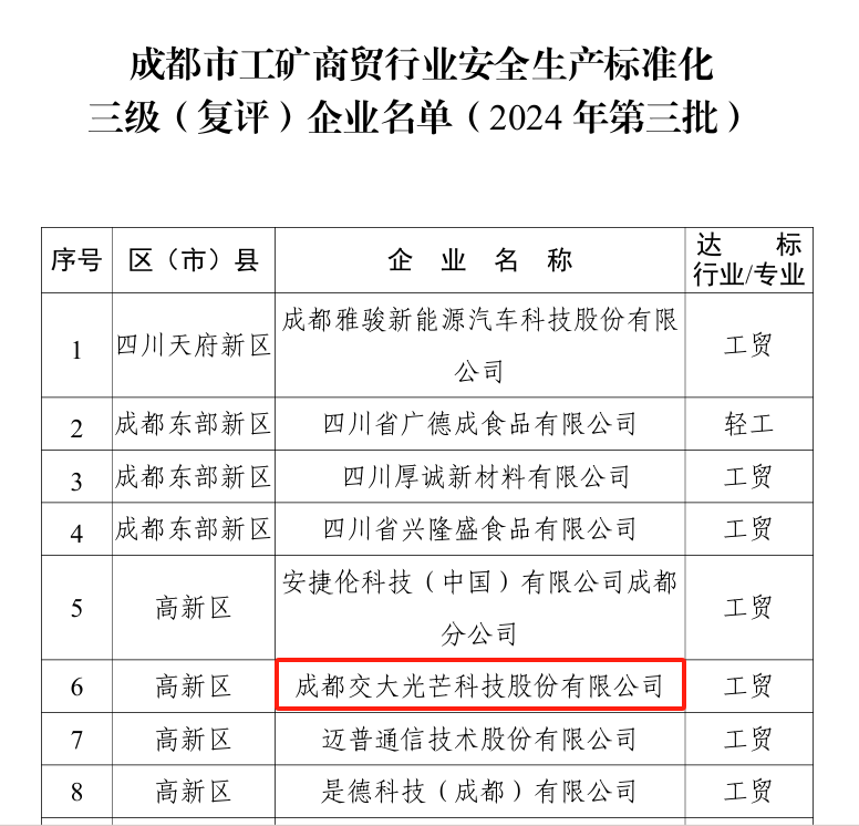 2024年9月,成都市應急局發(fā)布《關于公布成都市工礦商貿(mào)行業(yè)安全生產(chǎn)標準化三級(復評)企業(yè)名單(2024年第三批)的通知》,交大光芒通過安全生產(chǎn)標準化三級達標復評。