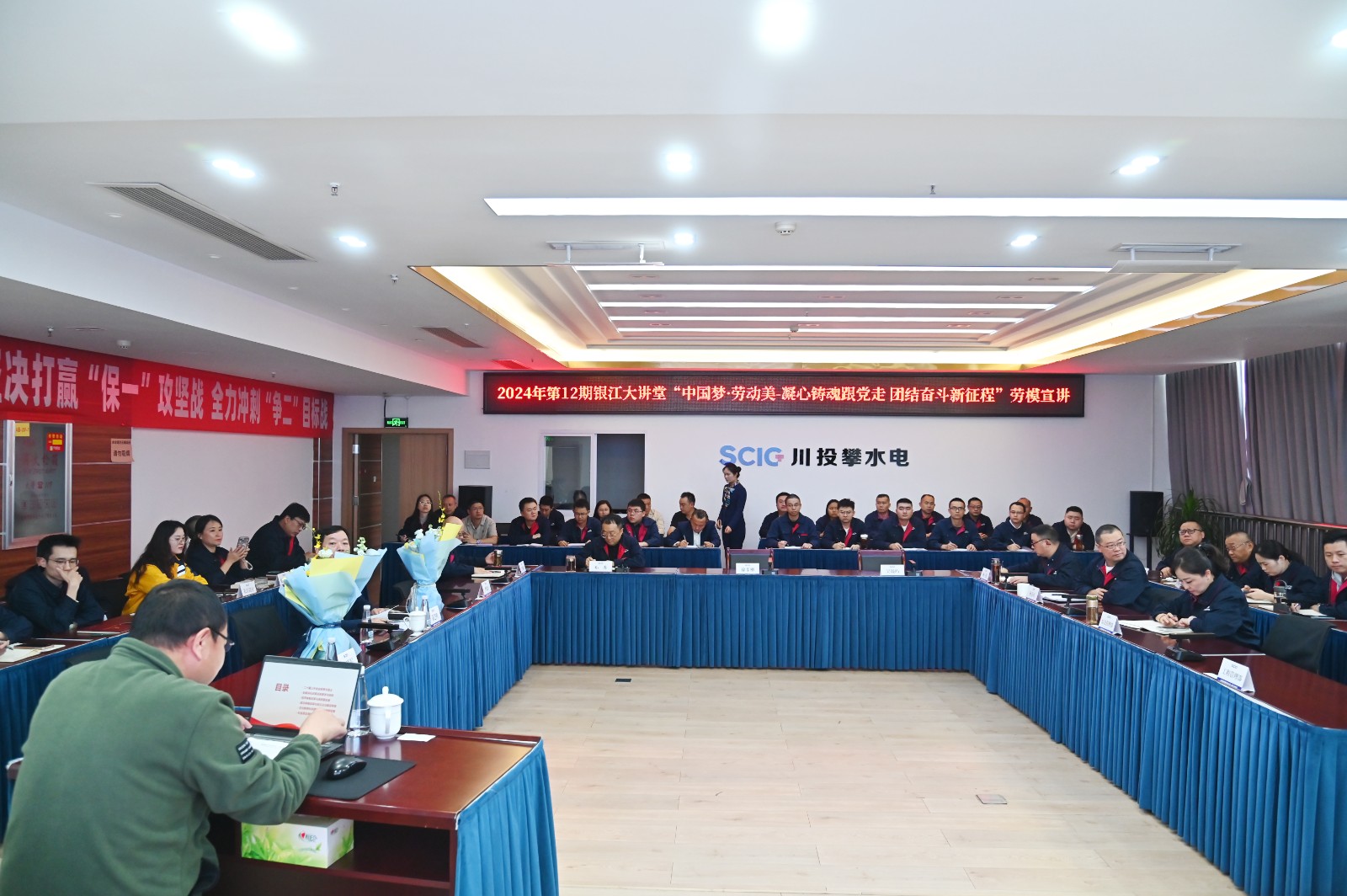 為大力弘揚(yáng)勞模精神、工匠精神和“三線精神”,充分發(fā)揮勞模、工匠、先進(jìn)典型的示范引領(lǐng)作用,形成學(xué)習(xí)先進(jìn)、對(duì)標(biāo)先進(jìn)、爭(zhēng)當(dāng)先進(jìn)的濃厚氛圍,按照攀枝花市東區(qū)總工會(huì)相關(guān)要求,11月23日,攀水電公司工會(huì)組織開(kāi)展了2024年“中國(guó)夢(mèng)?勞動(dòng)美——凝心鑄魂跟黨走 團(tuán)結(jié)奮斗新征程”勞模先進(jìn)事跡宣講,攀水電公司干部職工、參建單位代表共計(jì)40余人參加會(huì)議。
