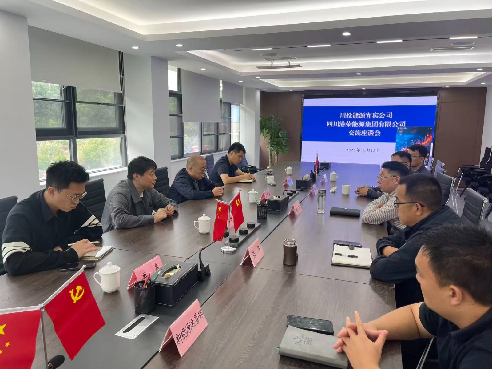 10月13日,攀新能源公司黨支部副書記、副總經理、工會主席,川投能源(宜賓)有限公司董事長郭夢夏一行赴四川港榮能源集團有限公司調研,雙方開展交流座談。港榮能源公司黨總支副書記、總經理李貌出席并主持座談會議。